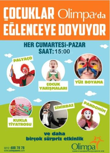 Olimpa AVM Hafta Sonu Çocuk Etkinlikleri, Haziran ayı boyunca her Cumartesi ve Pazar Olimpa Alışveriş Merkezi’nde çocuklarla buluşacak. Çocuklar; ‘Kukla Tiyatrosu’, ‘Palyaço’, ‘Sihirbaz’, ‘Yüz Boyama’, Kukla Tiyatrosu’ ve ‘Pandomim’ etkinliklerine katılma fırsatını yakalayacaklar.