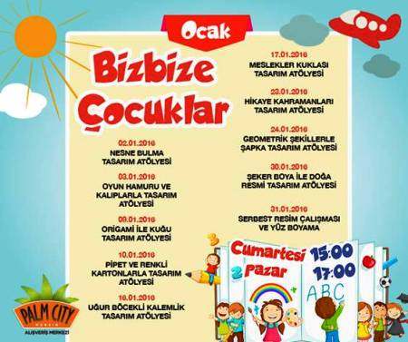 Palm City AVM Çocuk Atölyeleri, Biz Bize Çocuklar programı kapsamında Ocak ayı boyunca her hafta sonu çocuklarla buluşacak. Etkinlikler kapsamında, Uğur Böcekli Kalemlik Tasarım Atölyesi, Meslekler Kuklası Tasarım Atölyesi, Hikaye Kahramanları Tasarım Atölyesi, Geometrik Şekiller ile Şapka Tasarım Atölyesi, Şeker Boya ile Doğa Resim Tasarım Atölyesi, Serbest Resim Çalışması ve Yüz Boyama atölyeleri çocuklar ile gerçekleştirilecek.