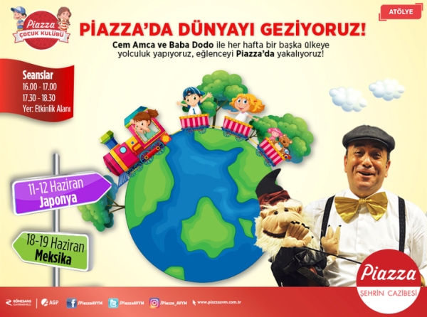 Piazza’da Dünyayı Geziyoruz, Haziran ayında Samsun Piazza Alışveriş Merkezi’nde çocuklarla buluşacak. Etkinlik kapsamında çocuklar, Cem Amca ve Baba Dodo ile her hafta başka bir ülkeye yolculuğa atılacaklar. Piazza’da Dünyayı Geziyoruz ile çocuklar 11-12 Haziran 2016 tarihleri arasında Japonya’yı, 18-19 Haziran 2016 tarihlerinde ise Meksika’yı gezecekler.