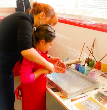 Çocuklar, İstanbul Oyuncak Müzesi’nde, Renklerin Suda Oyunu Ebru Atölyesi ile ebru sanatını öğreniyor.