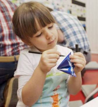 Programın ikinci aşamasında çocuklar, ilk aşamadaki yapıtların renk ve dokularını inceledikten sonra, yapışkan şekillerle ve boya kalemleriyle kendi sanat çalışmalarını yapıyor.