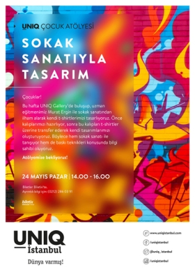 Eğlendirirken öğretmeyi amaçlayan Uniq İstanbul güzel sanatlar atölyeleri çocukların yaratıcılıklarını geliştirmeyi amaçlıyor. Murat Engin eğitmenliğinde gerçekleşecek olan “Sokak Sanatıyla Tasarım” atölyesi ile çocuklar sokak sanatından ilham alarak kendi t-shirtlerini tasarlayacaklar.