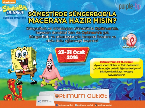 Sömestirde SüngerBob’la Maceraya Hazır Mısın? yarıyıl etkinlikleri kapsamında 23-31 Ocak 2016 tarihleri arasında İzmir Optimum Outlet Alışveriş Merkezi’nde çocuklarla buluşacak. Etkinlik kapsamında çocuklar, Sünger Bob ve arkadaşları ile tanışma fırsatını yakalayacaklar. Sünger Bob ve arkadaşları yarıyıl tatilinde İzmir Optimum AVM’ye gelerek çocuklara dolu dolu bir eğlence sunmayı amaçlıyor.