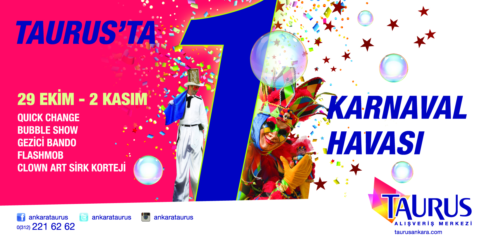 Ankaralılara 29 Ekim haftası boyunca bayram coşkusu yaşatacak olan Taurus AVM, etkinliklerine “Flashmob” gösterisi ile başlayacak. Saniyeler içerisinde kıyafet değiştirerek, izleyenleri şaşırtan “Quick Change Act”, 29-30 Ekim tarihleri arasında ziyaretçilerle bulaşacak. Büyük küçük herkes tarafından ilgiyle takip edilecek olan Taurus karnavalı, 1-2 Kasım tarihlerinde “Bubble Show” ve “Clown Art Sirk Korteji” ile devam edecek.