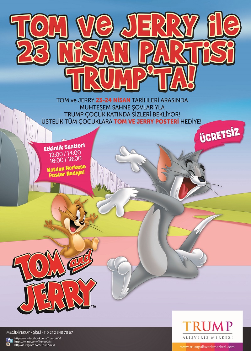 Çocukların en sevdiği çizgi karakterler arasında olan Tom ve Jerry, 23 Nisan etkinlikleri kapsamında, Trump AVM’de çocuklarla buluşacak. 23-24 Nisan tarihlerinde, sahne şovu gerçekleştirecek olan Tom ve Jerry, çocuklarla fotoğraf da çektirecek.