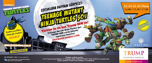 23, 24, 25 ve 26 Nisan tarihlerinde Ulusal Egemenlik ve Çocuk Bayramı etkinlikleri kapsamında, Teenage Mutant Ninja Turtles Şov düzenleyecek olan Trump Alışveriş Merkezi, çocuk katında 4 gün boyunca 23 Nisan’ı kutlayacak.