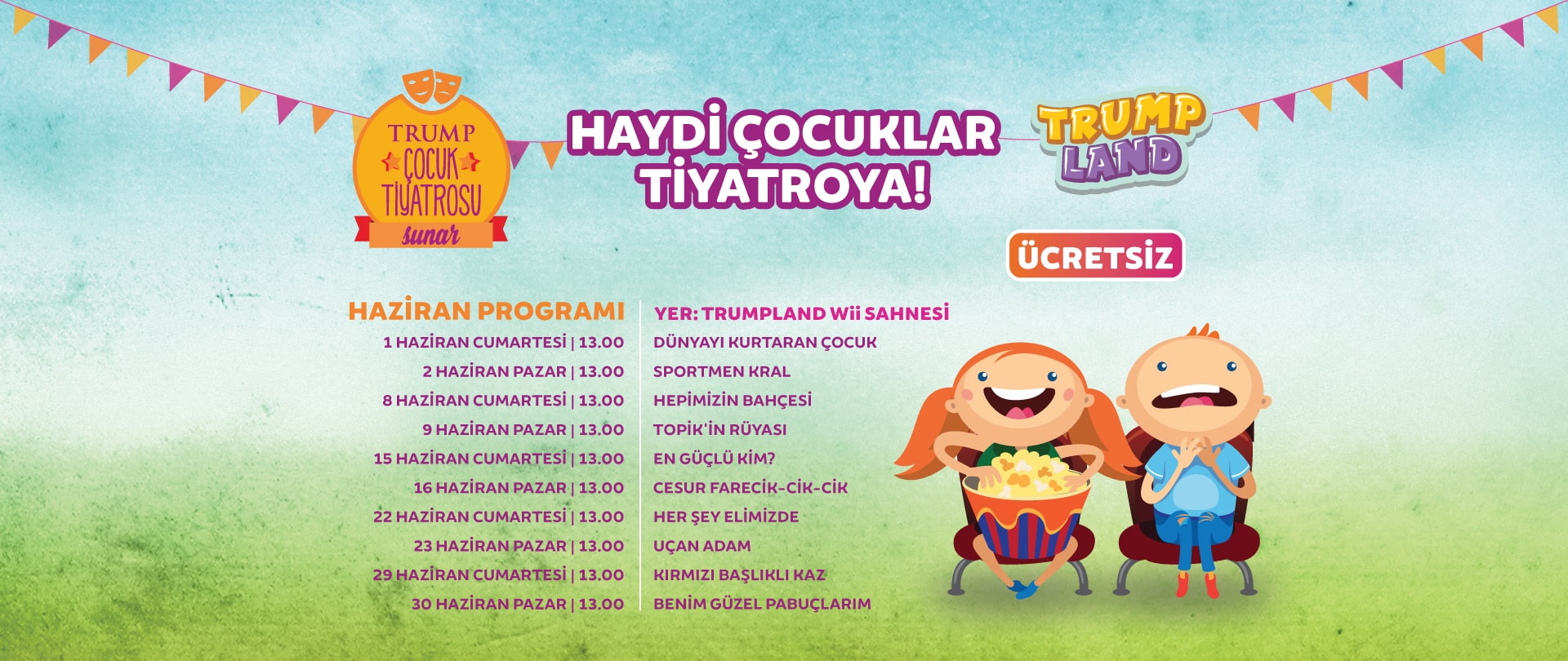 Trump Çocuk Tiyatrosu başlıyor. Trump Çocuk Katı’nda yer alan wii sahnede her cumartesi ve pazar günü saat 13.00’te ücretsiz çocuk tiyatrosu yer alıyor. Tüm çocuklar davetli.