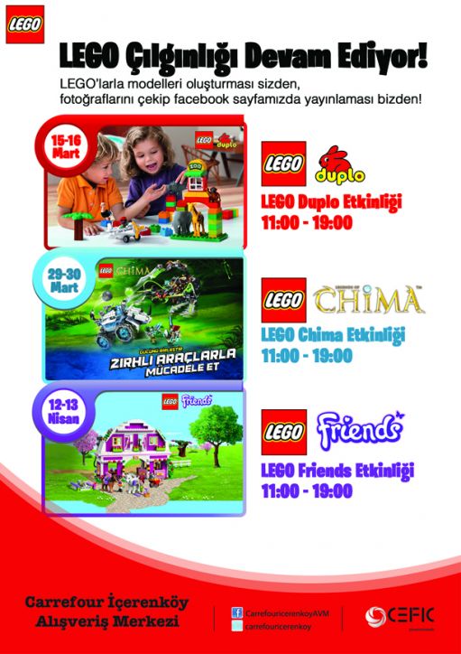 Tüm etkinliklerin sonunda çocukların oluşturduğu LEGO tasarımlarının fotoğraflarına Carrefour İçerenköy Alışveriş Merkezi Facebook sayfasından ulaşılabilecek.
