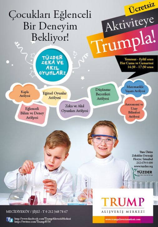 TÜZDER tarafından düzenlenen ücretsiz zeka ve akıl oyunları atölyeleri, Temmuz-Eylül ayı boyunca her Cuma ve Cumartesi 14.30- 17.30 saatleri arasında, Trump AVM Çocuk Katı'nda çocukları bekliyor.