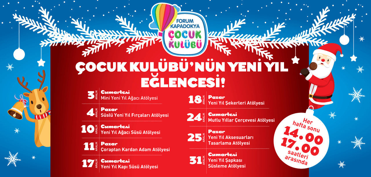 Nevşehir çocuk etkinlikleri kapsamında, Forum Kapadokya AVM, çocuklar için yeni yıl eğlencesi düzenliyor. Tüm çocukların ücretsiz olarak katılabileceği etkinliklerde, çocuklar yeni yıl aksesuarları, yeni yıl şapkası ve mutlu yıllar çerçevesi gibi atölye çalışmalarına katılacak.