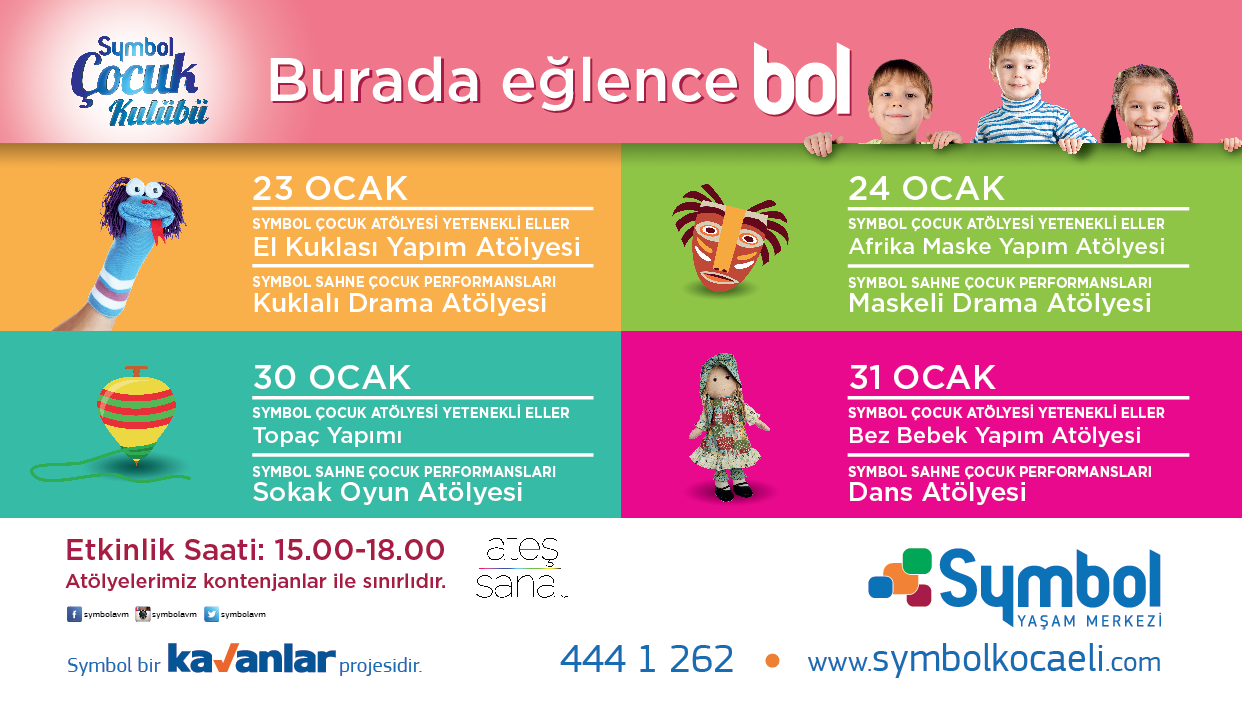 Kocaeli Symbol AVM, sömestr tatili kapsamında, çocuklar için sanat atölyeleri düzenleyecek. 23-24 Ocak ile 30-31 Ocak tarihleri arasında gerçekleştirilecek olan atölyelere katılım ücretsiz olacak.