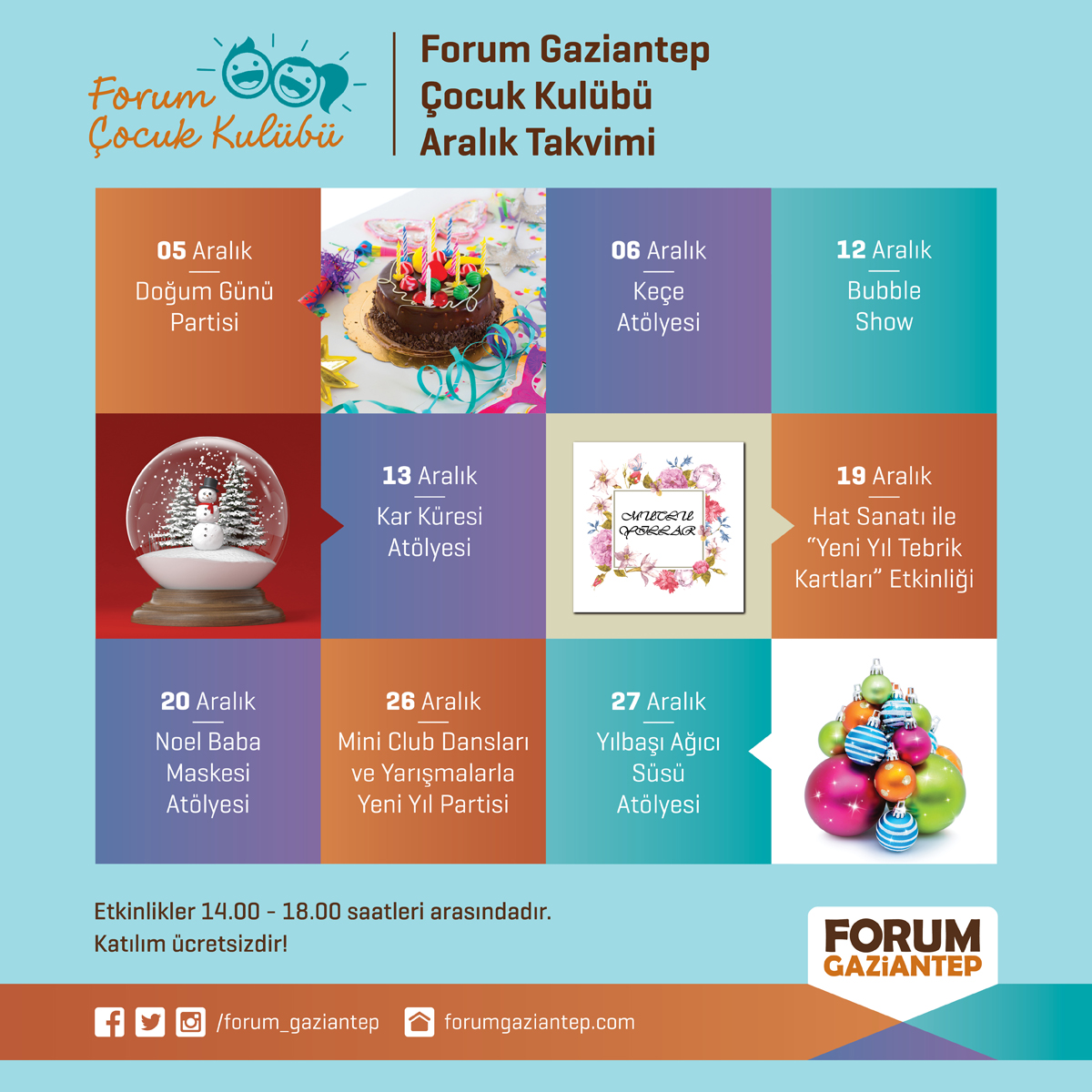 Gaziantep çocuk etkinlikleri kapsamında, Forum Gaziantep AVM, Aralık ayında çocuklar için yılbaşı etkinlikleri düzenliyor. Aralık ayı boyunca her hafta sonu gerçekleştirilecek olan etkinlikler kapsamında, çocukların hem eğlenmesi hem de yılbaşına hazırlık yapması hedefleniyor.