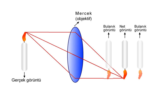 Şimdi de mercekler yardımıyla netlik ayarı nasıl yapılır, gelin birlikte inceleyelim. Eğer film merceklerin odak uzaklığındaysa, görüntümüz net olacaktır. Film odak uzaklığının önünde veya arkasında ise, bulanık olacaktır. Bunu aşağıdaki şekilden daha iyi anlayabiliriz.