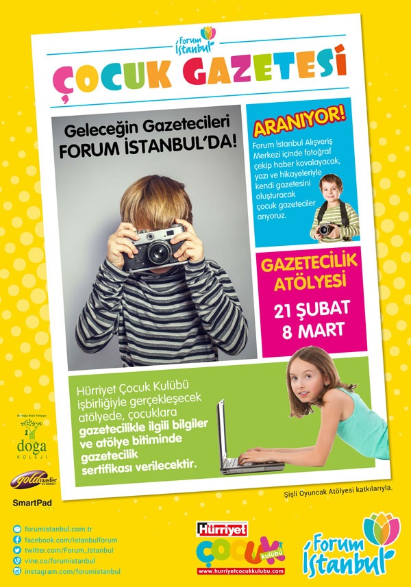 Hürriyet Çocuk Kulübü’nün yönetiminde hazırlanacak gazete ile geleceğin gazetecileri keşfedilecek. 21 Şubat ile 8 Mart 2015 tarihleri arasında Forum İstanbul Çocuk Gazetesi Atölyesi’nde yapılacak çalışmalar ile çocuklar hem gazetecilik ile ilgili bilgiler öğrenecek hem de fotoğraf çekip haber peşinde koşacak. İlgilendikleri ya da ilginç buldukları her şeyi habere dönüştürmeye çalışacak olan çocuklar, Şişli Ahşap Oyuncak Atölyesi ile de ahşaptan oyuncaklar yapacak.