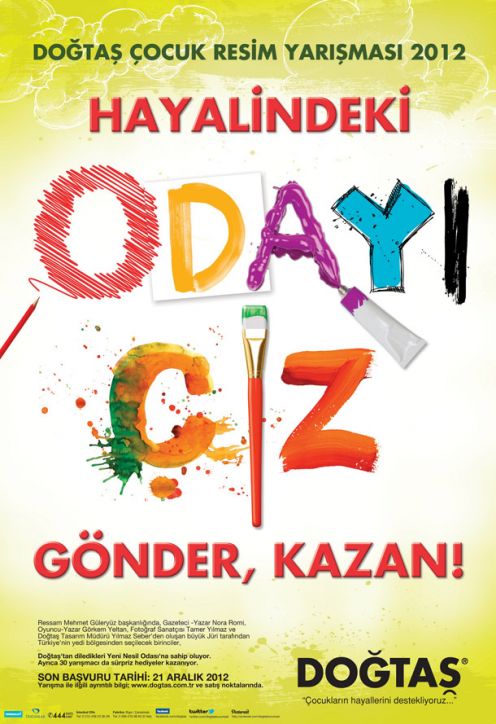 Doğtaş, 6-11 yaş aralığındaki tüm çocukları resim yapmaya davet ediyor. Yarışmaya; hem Doğtaş mağazalarından temin edilebilen katılım formu doldurularak “Doğtaş, Rüzgarlıbahçe Mah. Kavak Sokak No:31/1 Smart Plaza B Blok Kat:6 Kavacık Beykoz, İstanbul” adresine posta yoluyla gönderilen resimlerle; hem de web adresinde yer alan ilgili bölüme yüklenen resimlerle başvuru yapılabilecek. Çocukların hayallerindeki odayı çizeceği yarışma, 20 Aralık 2013 tarihinde sona erecek.