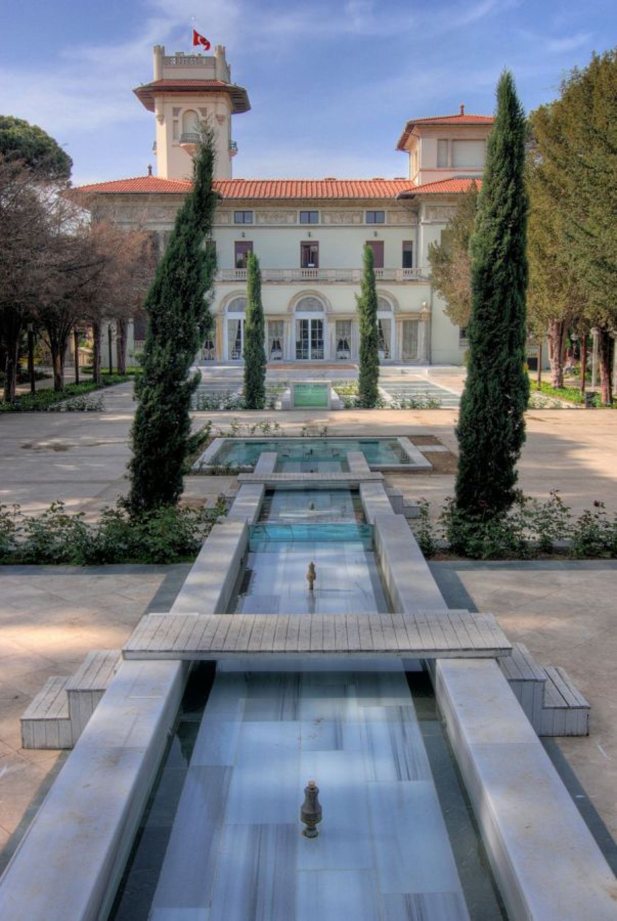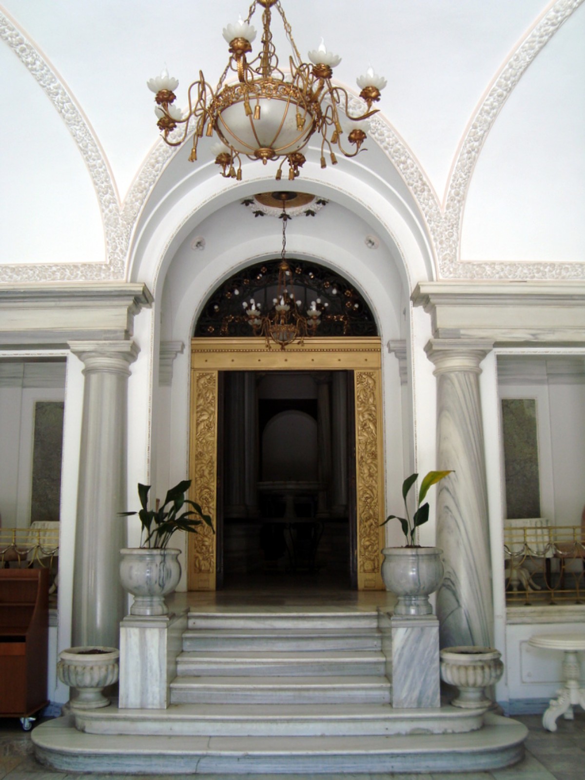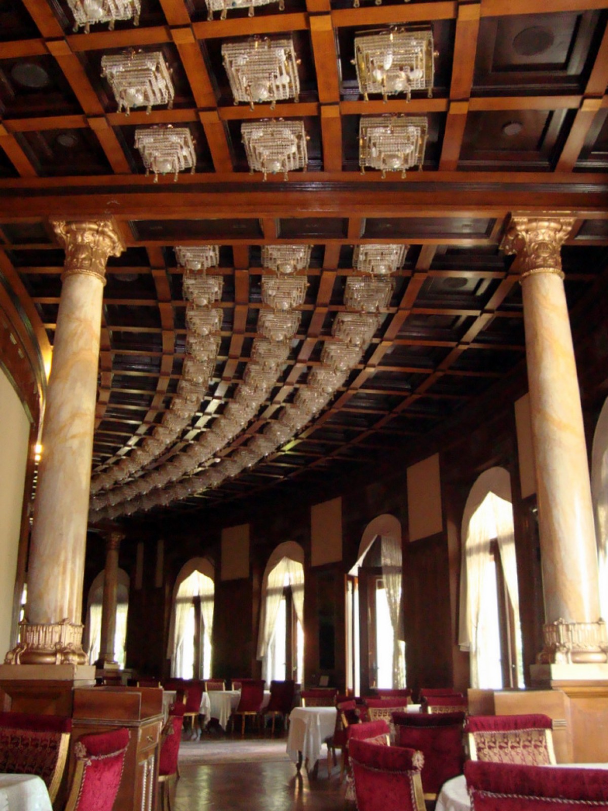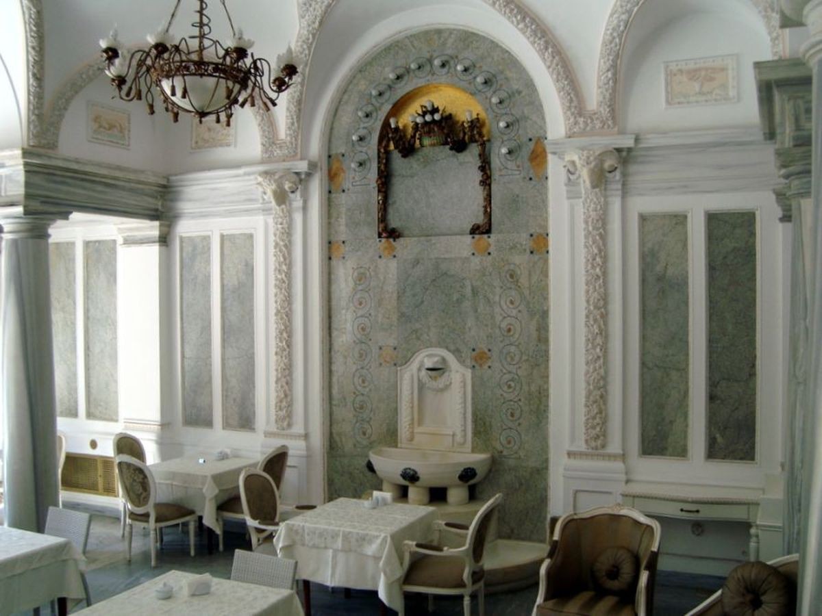 Kasrın mermer salonunda tavana kadar uzanan anıtsal bir çeşme yer alıyor. Mozaiklerle süslü bu çeşmenin zemine yakın kısmı, mermer bir tekneyle süslenmiş ve tekneye, “Art Nouveau” stilinde sık kullanılan figürlerden bir kurbağa su akıtıyor.