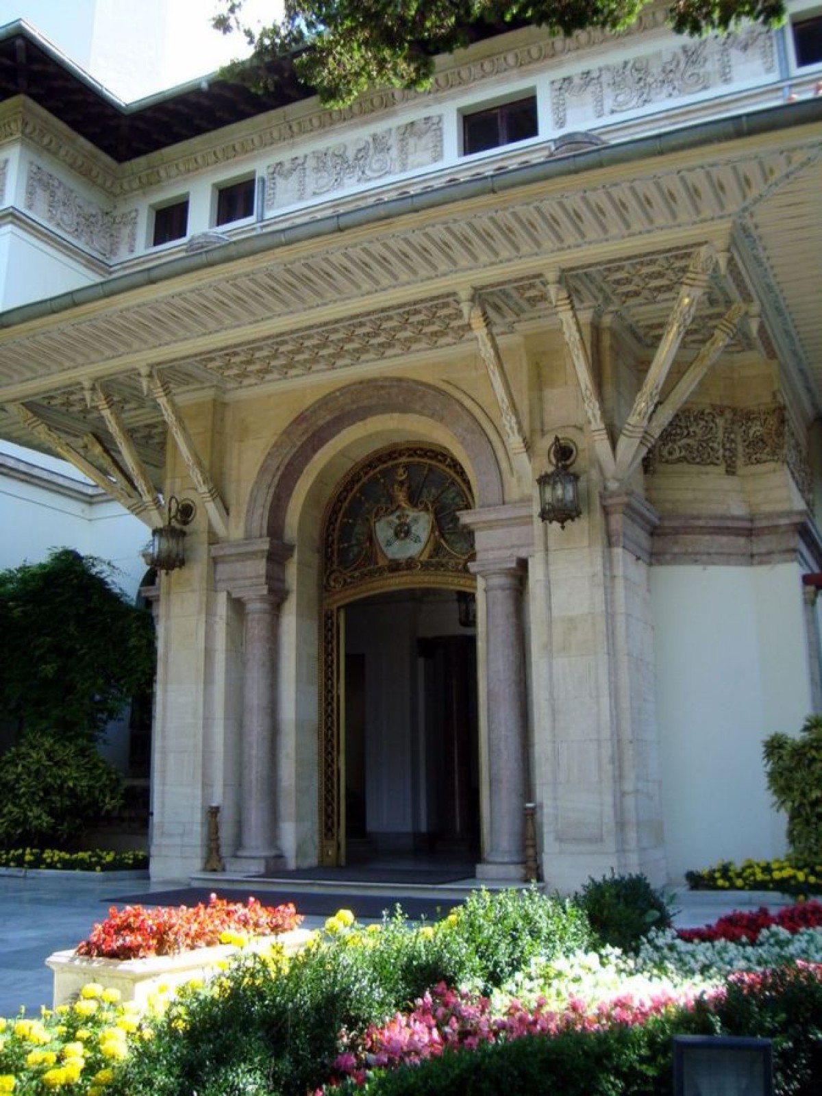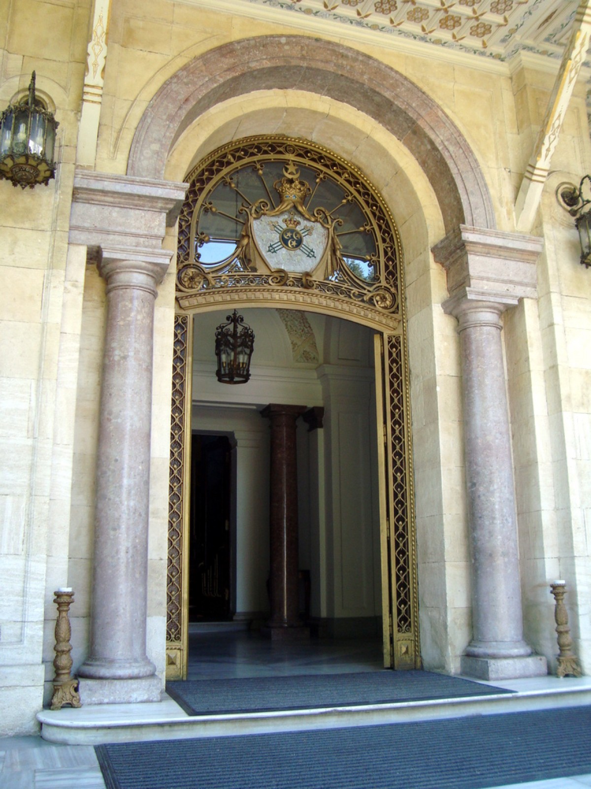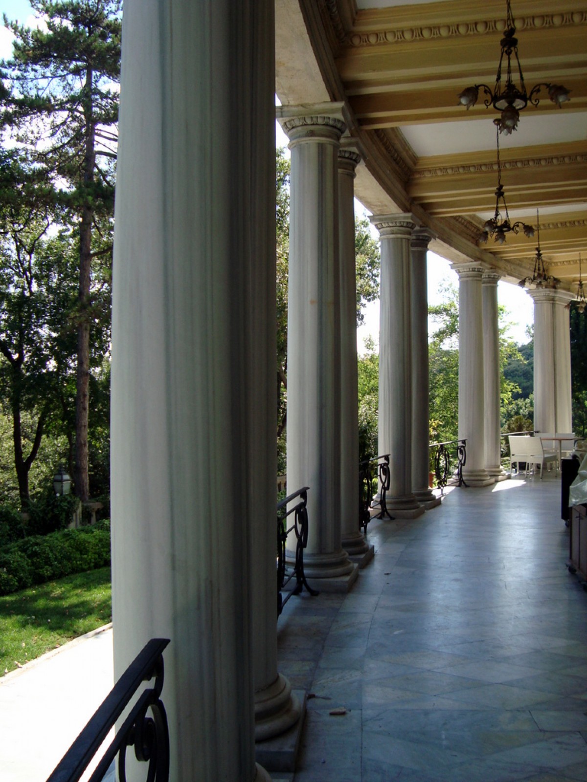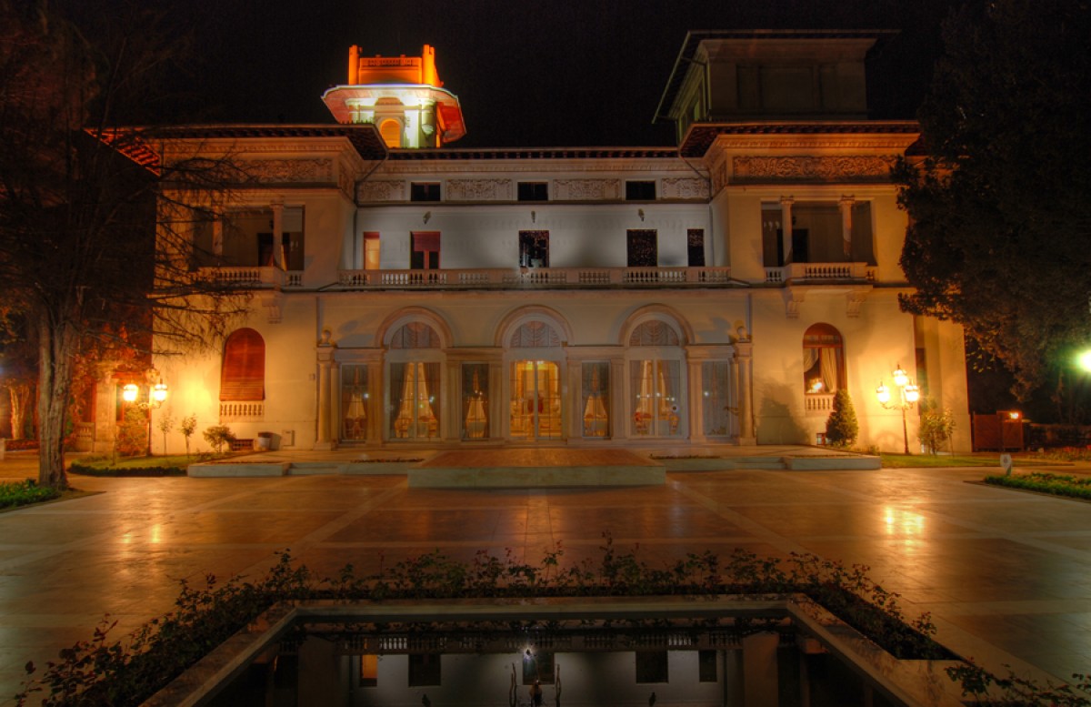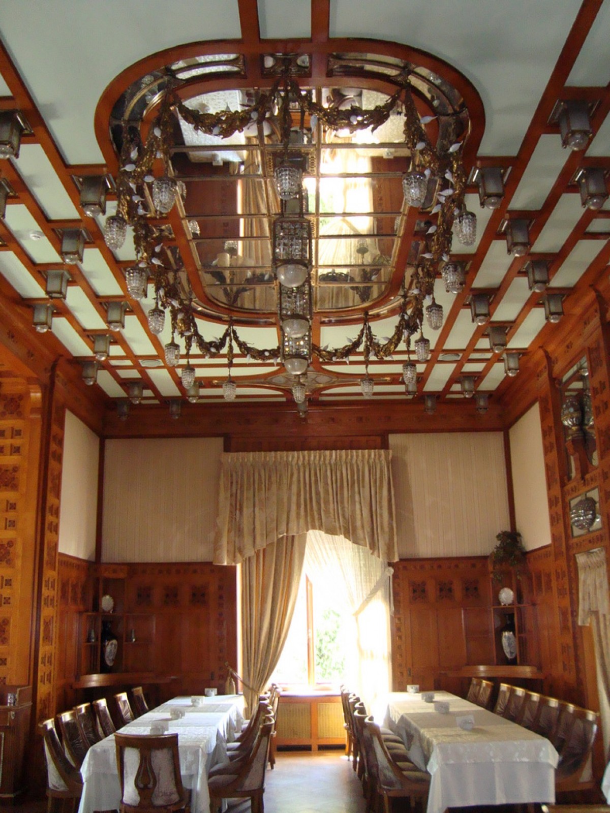 Kasrın mermer salonunda tavana kadar uzanan anıtsal bir çeşme yer alıyor. Mozaiklerle süslü bu çeşmenin zemine yakın kısmı, mermer bir tekneyle süslenmiş ve tekneye, “Art Nouveau” stilinde sık kullanılan figürlerden bir kurbağa su akıtıyor.