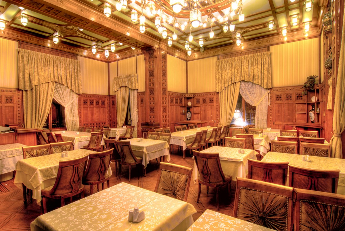 Mermer salonun aksine yer, duvar ve tavanı ahşap kaplama olan şömineli Konkav Salon, ağır bir atmosfer taşıyor. Bu duygu yemyeşil manzaralı bir terasa açılan pencerelerle dengeleniyor.