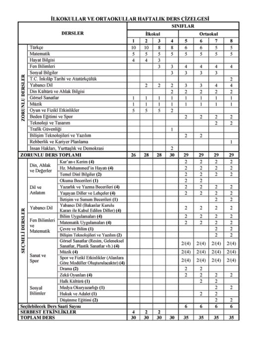Buna göre ortaokul 5.ve 6. sınıflara “Bilişim Teknolojileri ve Yazılım” dersi getirildi. Haftada 2 saat zorunlu ders kapsamına alınan bu dersle birlikte, haftalık yabancı dil saatleri bir saat azaltıldı ve haftalık toplam zorunlu ders saati sayısı 28’den 29’a çıktı. Diğer önemli bir değişiklik ise haftalık toplam seçmeli ders sayısının 8’den 6’ya indirilmesi oldu.