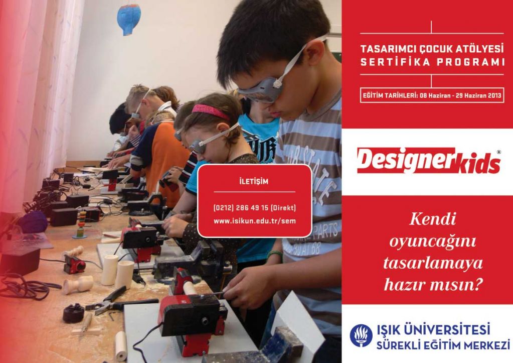 8-12 yaş arası çocukları, güvenli atölye ortamında üç boyut ilişkisi üzerinden tasarım disipliniyle tanıştırmaya hazırlanan “Tasarımcı Çocuk Atölyesi”sertifika programı, Işık Üniversitesi Maslak Kampüsü’nde 8 Haziran – 7 Ağustos 2013 tarihleri arasında devam ediyor.