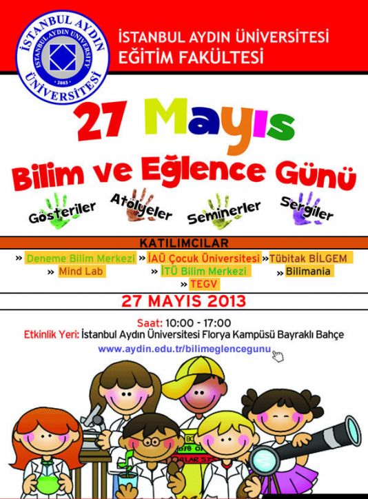 İstanbul Aydın Üniversitesi Eğitim Fakültesi’nin bu yıl ilkini düzenlediği “Bilim ve Eğlence Günü”, 27 Mayıs Pazartesi günü İstanbul Aydın Üniversitesi Florya Yerleşkesi’nde 10.00 – 17.00 saatleri arasında gerçekleşiyor.
