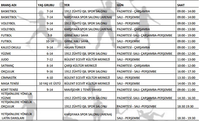Branşlar: Basketbol, Voleybol, Futbol, Kaleci Okulu, Yüzme, Judo, Satranç, Okçuluk, Jimnastik, Masa Tenisi, Kort Tenisi