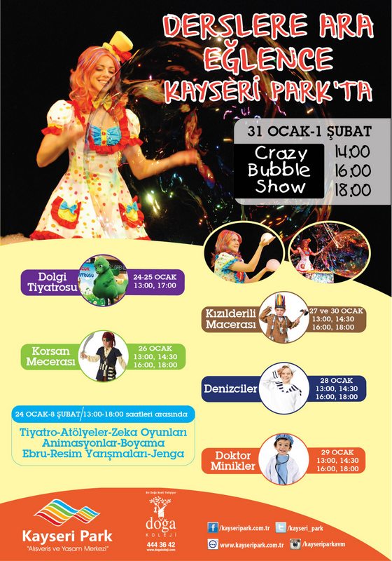 Dünyanın birçok bölgesinde gösteriler yapan Crazy Bubble Show, 31 Ocak ve 1 Şubat tarihleri arasında Kayseri Park AVM’ye gelecek. Farklı şekillere sahip dev köpükler ile Kayseri’de 3 gösteri yapacak olan Crazy Bubble Show, 31 Ocak ve 1 Şubat tarihlerinde 14.00, 16.00 ve 18.00 saatlerinde izleyiciler ile buluşacak.