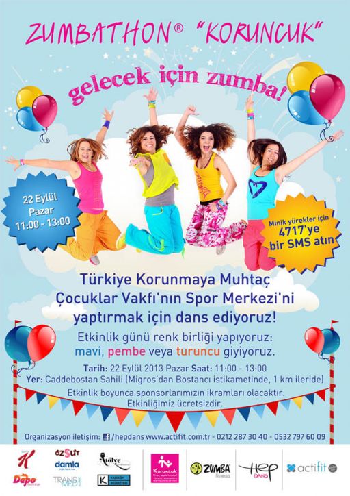 Dünyanın dört bir yanında milyonlarca kişi tarafından yapılan, hem dans hem spor konseptiyle eğlenceli bir program öneren Zumba® dansı bu sefer Türkiye Korunmaya Muhtaç Çocuklar Vakfı (Koruncuklar) için tempo tutuyor. 22 Eylül Pazar günü Caddebostan sahilinde Caddebostan sahilinde Türkiye'nin önde gelen Zumba® eğitmenleri, kurup yaşattığı çocuk köyleri ile ailesi olmayan veya terk edilen, kişisel varlığı tehdit altında olan, ihmal veya istismara uğramış, kötü alışkanlıklara karşı savunmasız bırakılmış korunmaya muhtaç çocukları korumak ve yetiştirmek için çalışan Koruncuklar için nefes kesen bir dans gösterisi yapacak.