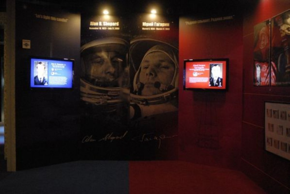 Her iki ülkenin çalışmalarının mavi ve kırmızı renkle ayrılan panolarda anlatıldığı bölümde, Soğuk Savaş’ın tarihini de takip etmek mümkün.