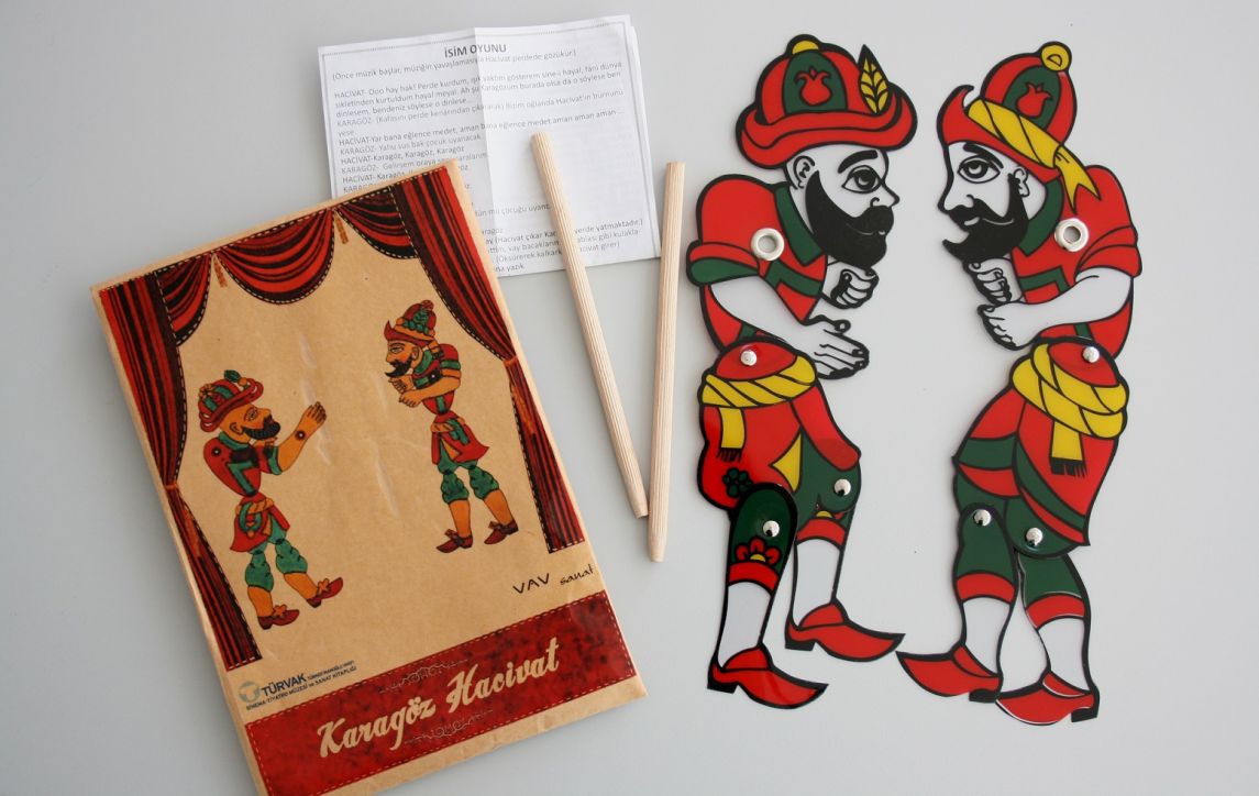 TÜRVAK Müzesi’nde, ahşap oynatıcı çubukları ve oyun metni ile birlikte satışa sunulan Karagöz-Hacivat tasvirleri, çocuklara ve eski Ramazan günlerine özlem duyan büyüklere “Hayali” olma şansını veriyor.