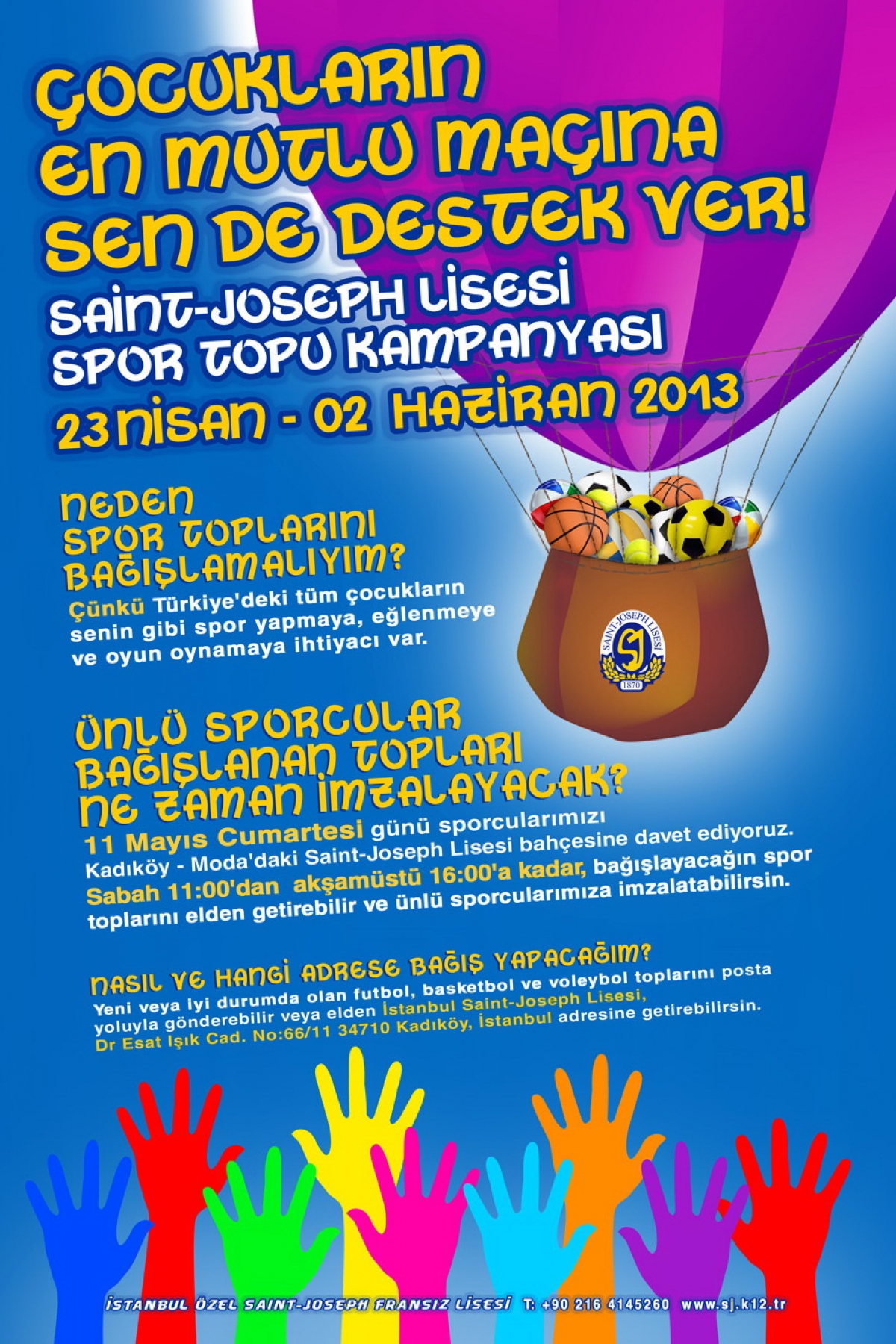 “Çocukların En Mutlu Maçı” kampanyası kapsamında İstanbul Saint Joseph Lisesi, 2 Haziran2013 tarihine kadar bağışlanacak futbol, basketbol ve voleybol toplarını Anadolu’da ihtiyaç sahibi çocuklara ulaştıracak.