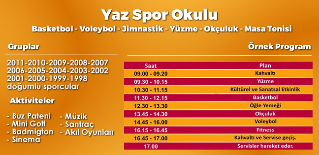 Galatasaray Spor Okulları, yaz döneminde çocukların hem uzman eğitmenler aracılığı ile spor yapabileceği, hem de farklı etkinliklere katılabileceği bir program düzenledi. İki dönem devam edecek olan yaz okulu kapsamında, 4-17 yaş aralığındaki çocuklar bireysel ve takım sporları ile ilgilenebileceği gibi, kişisel gelişimi destekleyecek nitelikteki aktivite programlarına da katılabilecek.