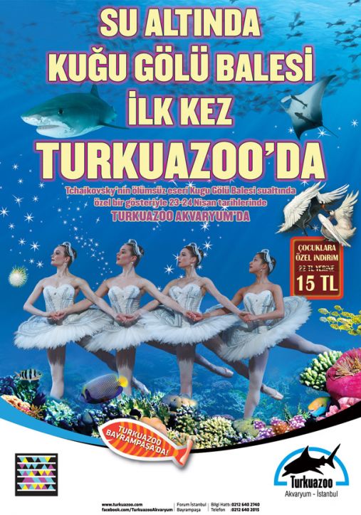 Sualtında gerçekleşecek olan Kuğu Gölü Balesi 23 Nisan Salı ve 24 Nisan Çarşamba günlerinde, 13.15, 14.15, 15.15 ve 16.15’te saatlerinde yapılacak. Bu tarihlerde Turkuazoo’yu ziyaret eden 16 yaş altı çocuklara özel olarak bilet fiyatları 22 TL yerine 15 TL olarak uygulanacak.