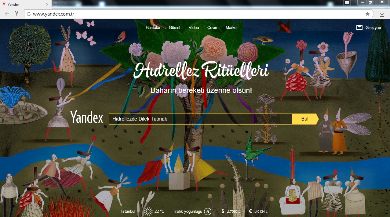 Yandex, 5 Mayıs gecesi kutlanan Hıdırellez için özel bir tasarım yaptı. Ana sayfa tasarımının yanı sıra, arama sonuçlarını da kapsayan değişiklikte, kullanıcılara etkinlik takvimi ve Hıdırellez ile igili önemli bilgilere ulaşmada da kolaylık sağlanıyor.