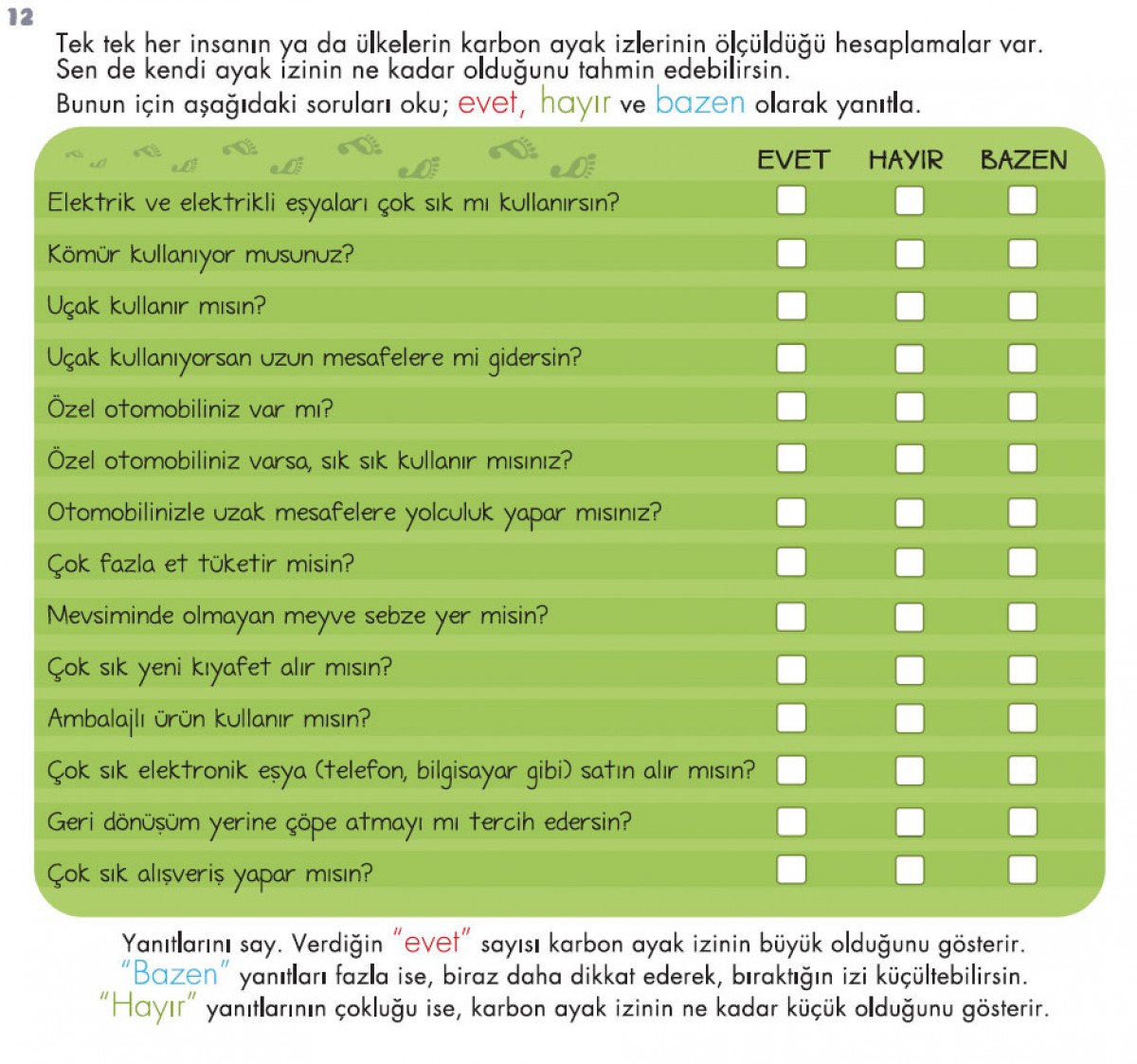 Sibel Şengül tarafından yazılan ve Halime Keskin tarafından resimlenen kitapta, çocuklar, basit bir tablo yardımıyla yol açtıkları karbon ayak izinin oranını kendisi hesaplayabiliyor. Çıkan sonuca bağlı olarak, yol açtıkları karbon salım oranını evin sıcaklığını 2 derece düşürmek, ambalajlı ürün kullanımını olabildiğince azaltmak, yaşanılan bölgede yetiştirilen ürünleri tercih etmek gibi uygulanabilecek basit önerilerle günlük hayatta nasıl azaltabileceklerini de öğreniyorlar.